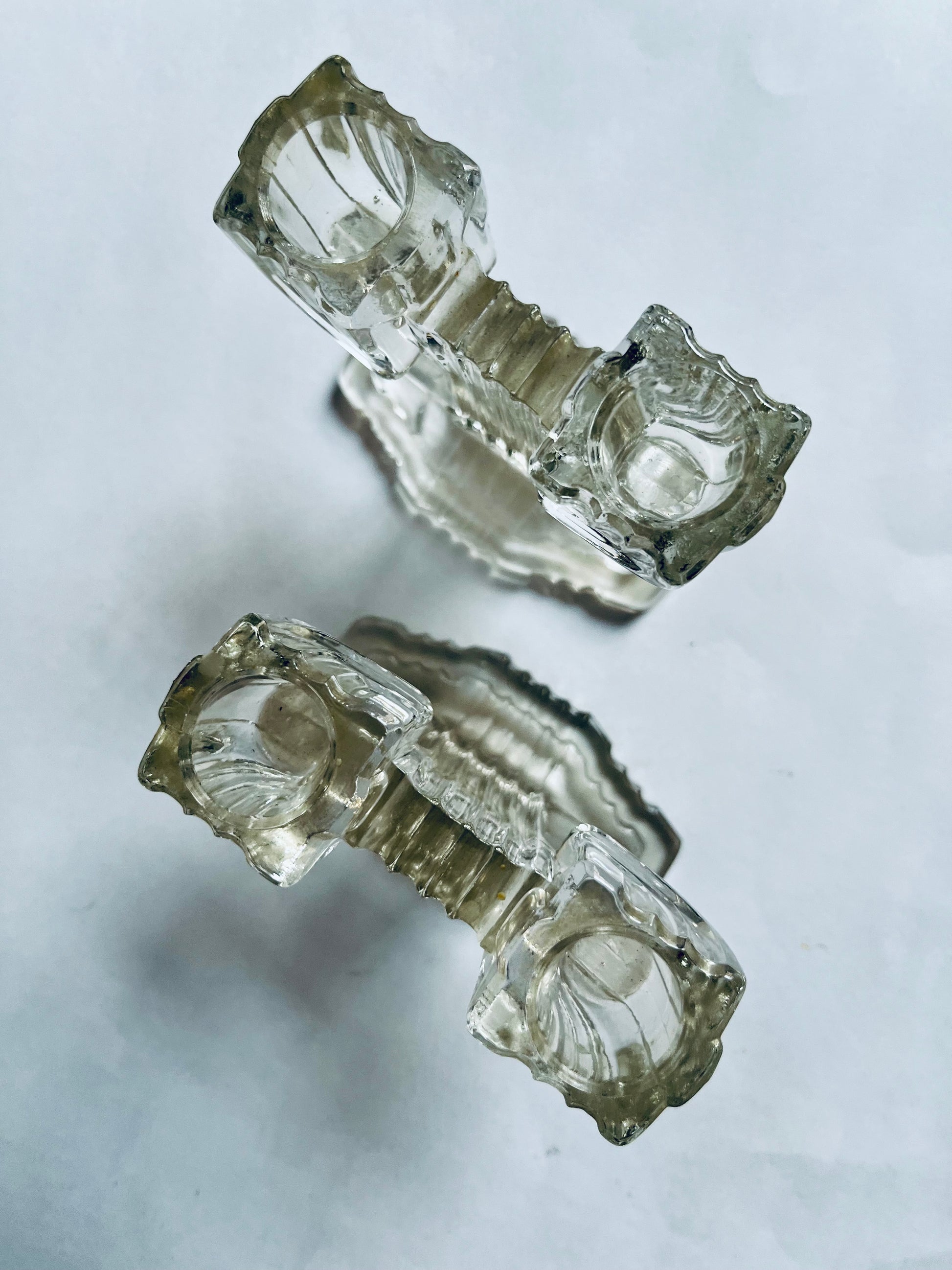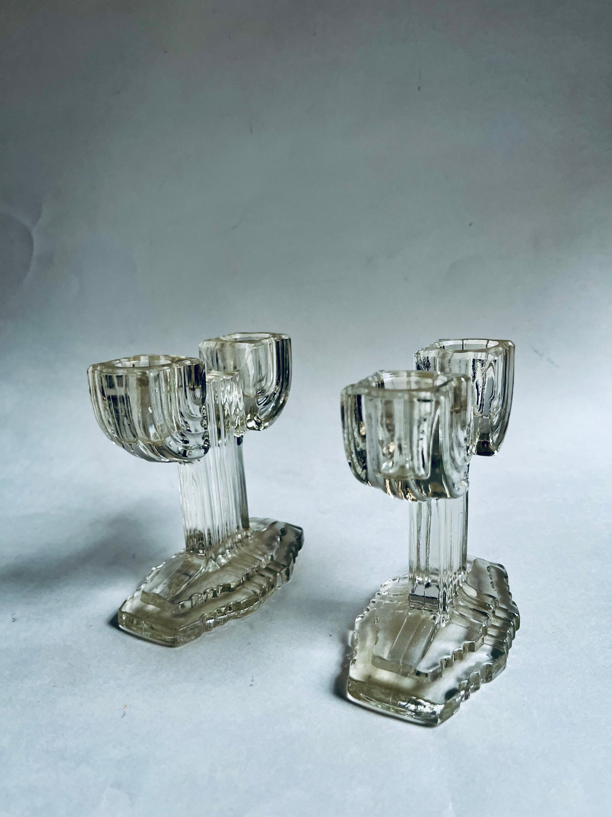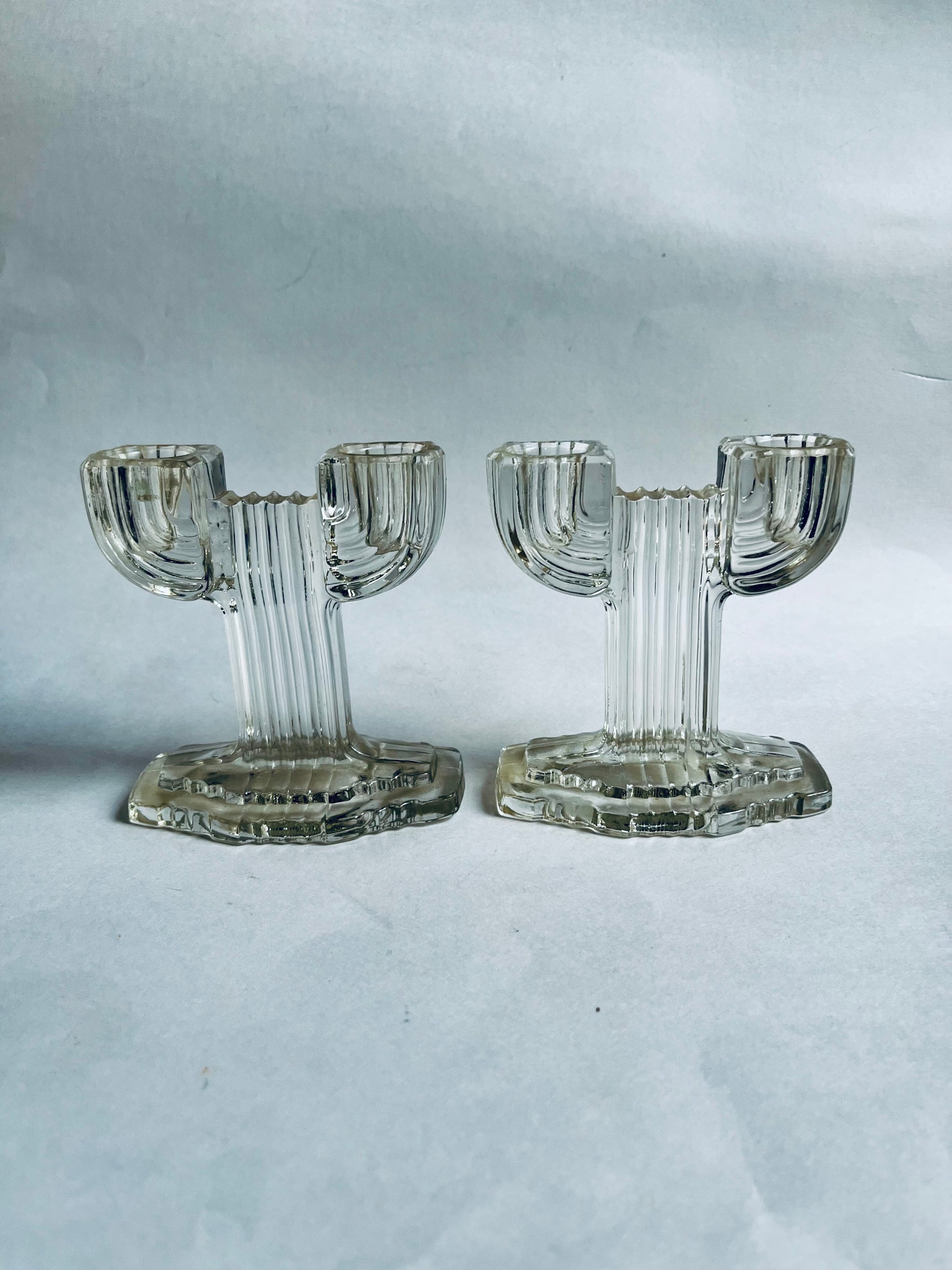 Sculptural Art Deco glass candle holders featuring double arms, stepped bases, and beautiful ribbed detailing. 1940s Anchor Hocking.