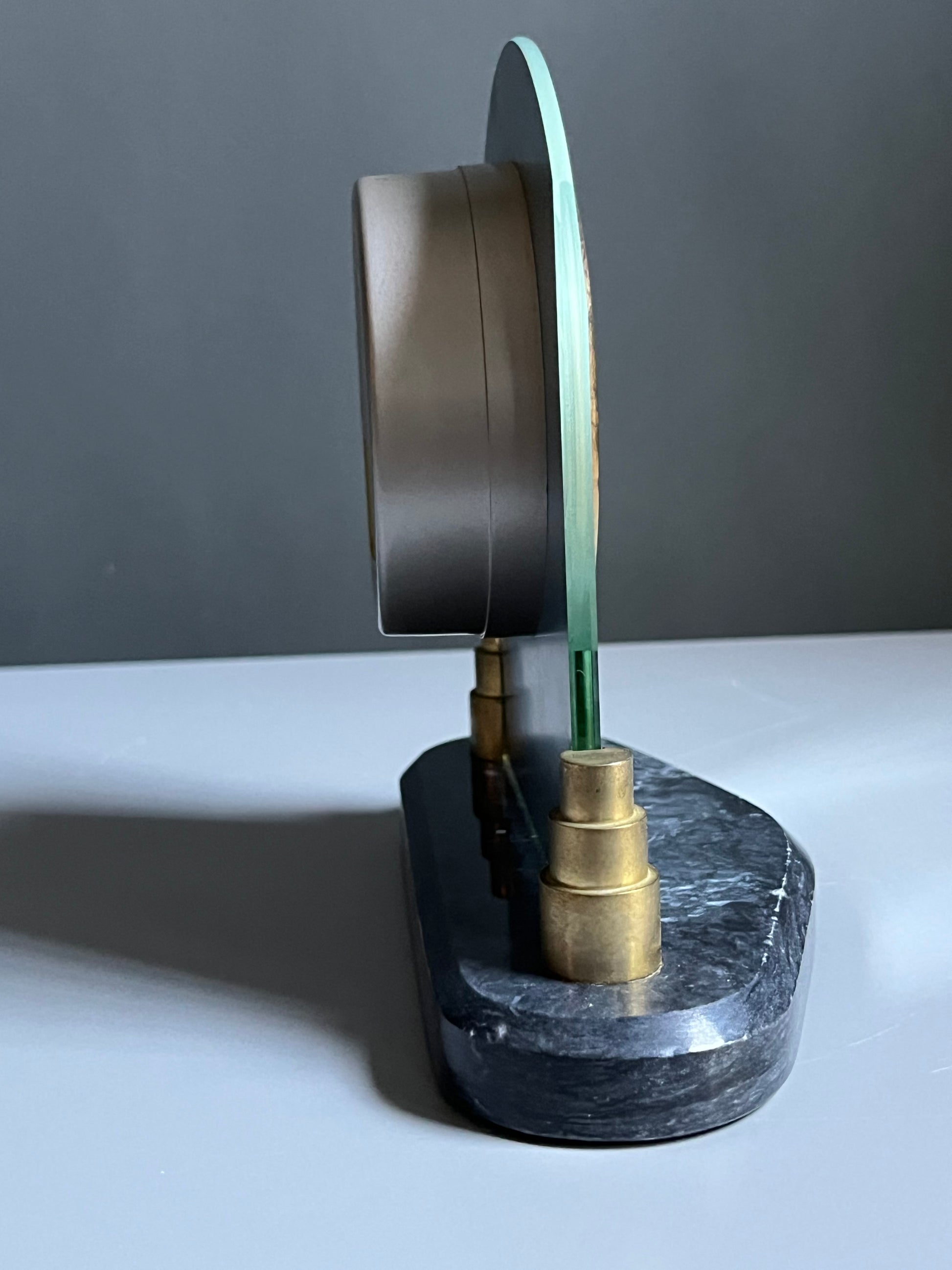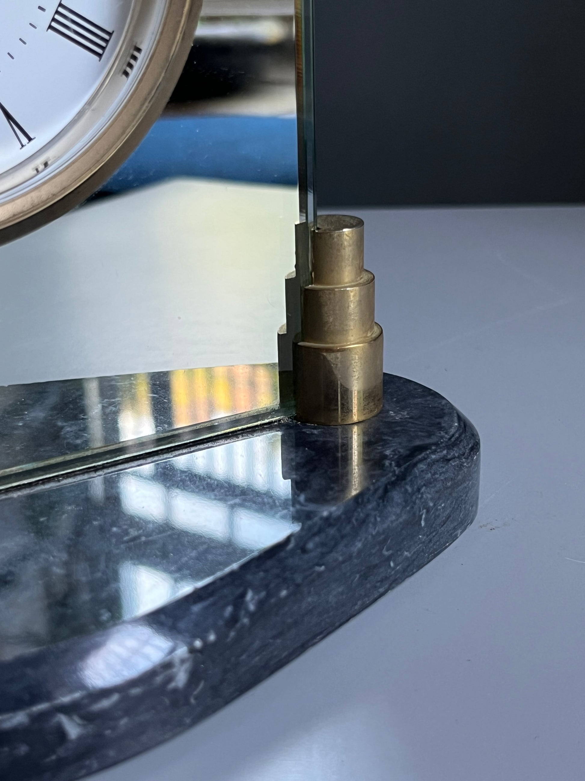 Quartz clock with stepped Deco brass details, mirrored glass face, and heavyweight green marble base. Roman numeral dial framed in gold, battery operated and fully functional.