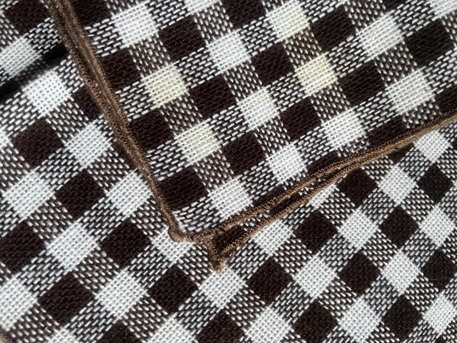 Set of eight vintage brown and white gingham cloth napkins with neatly finished stitched edges.