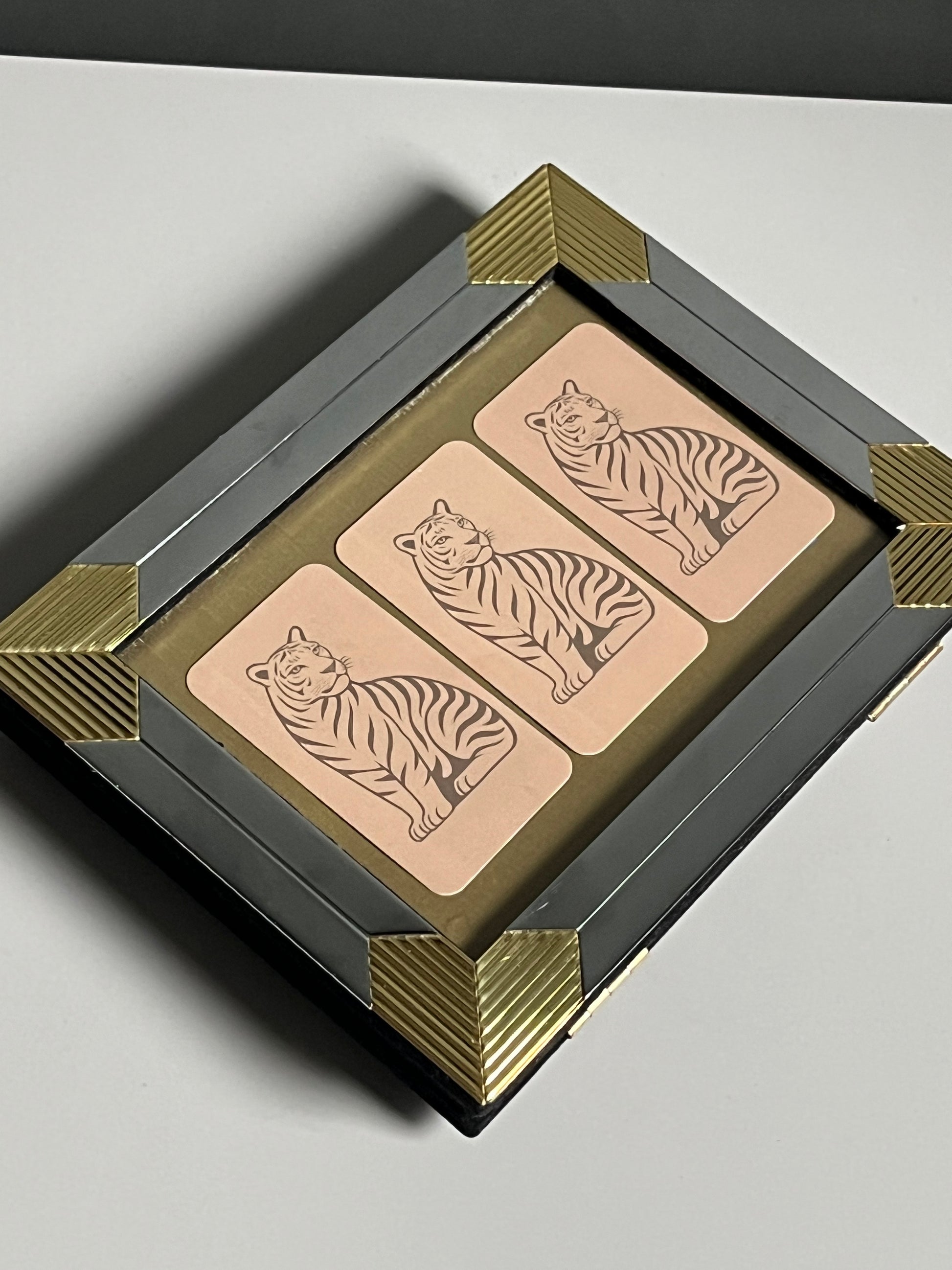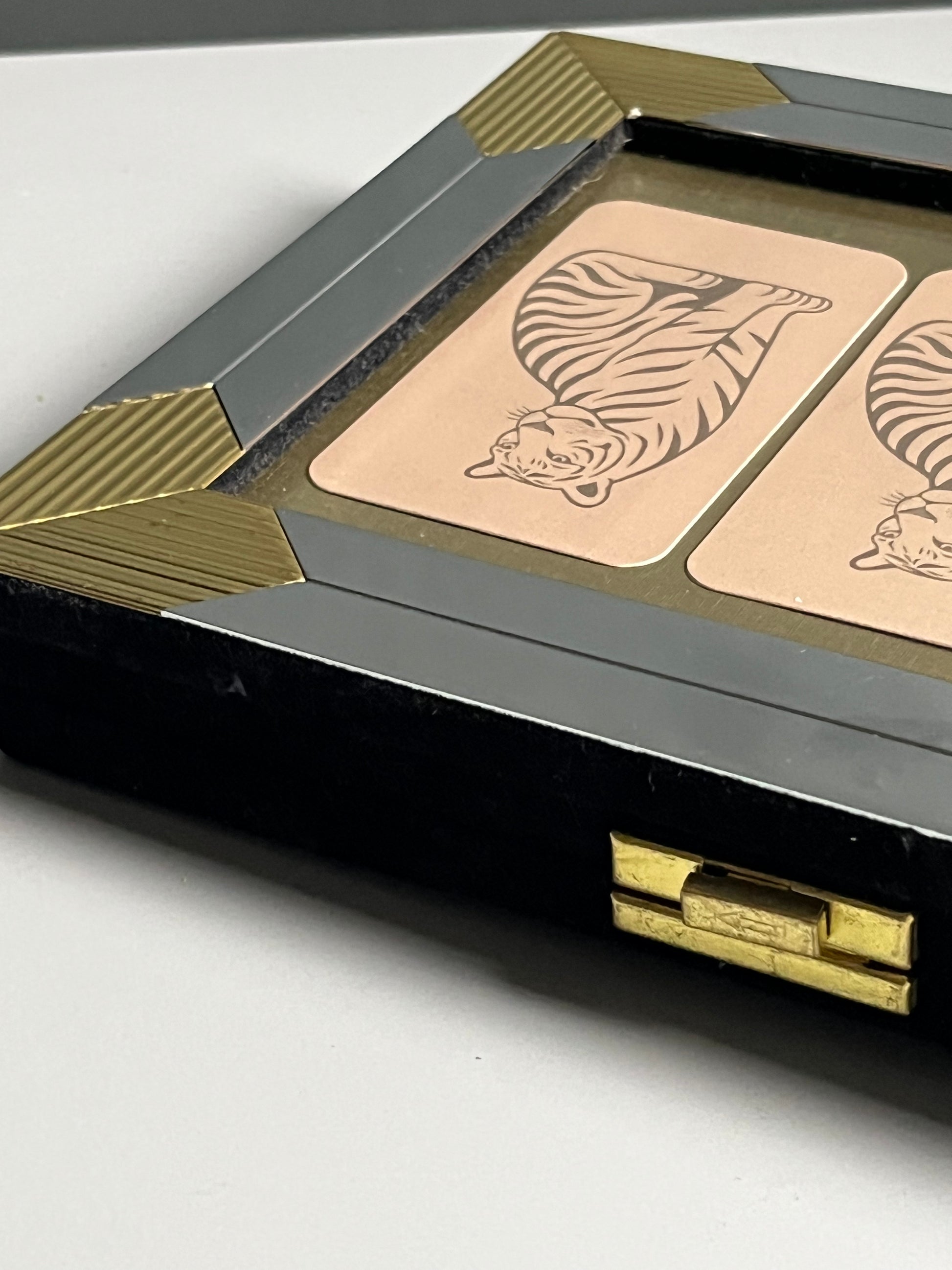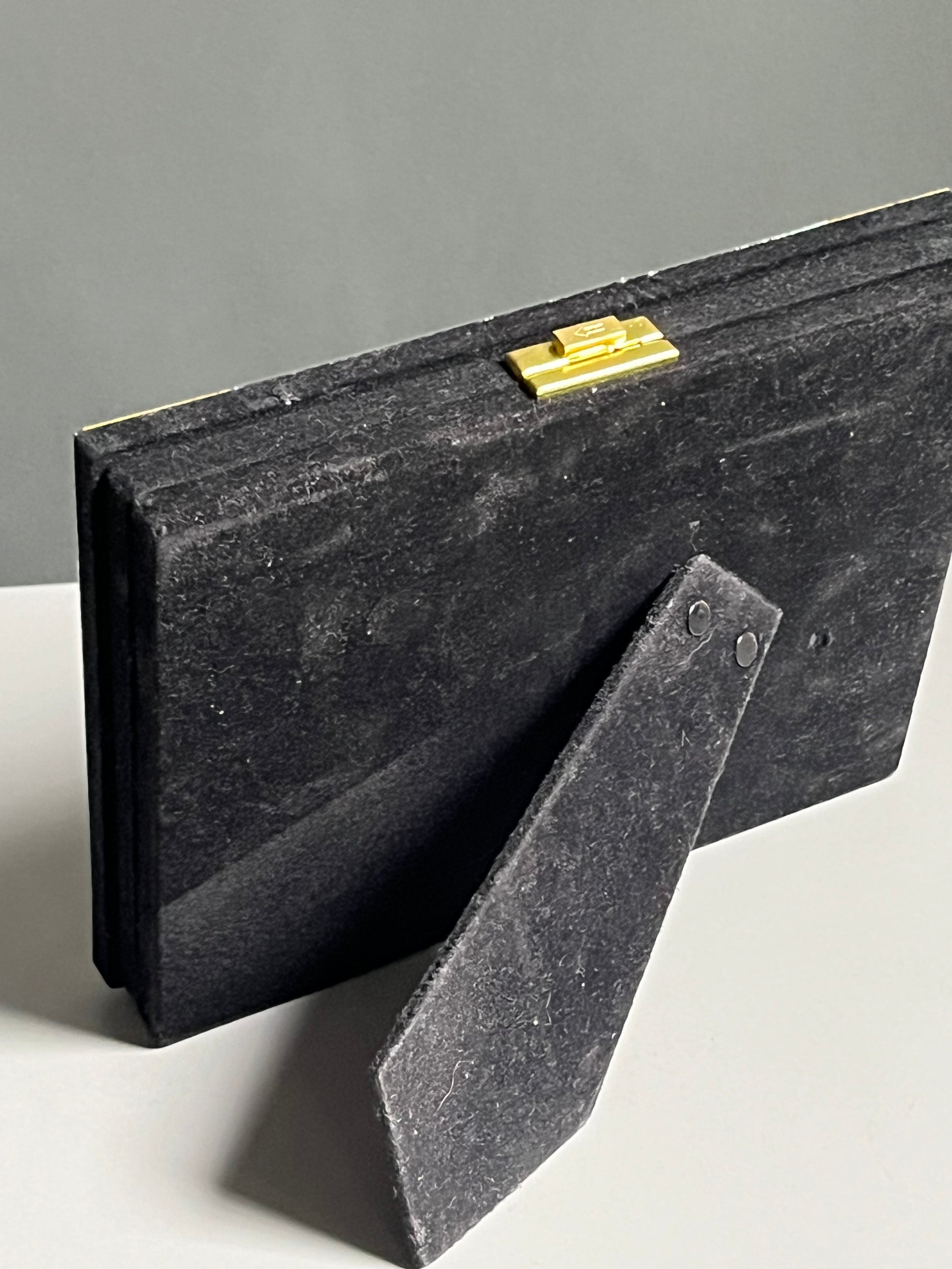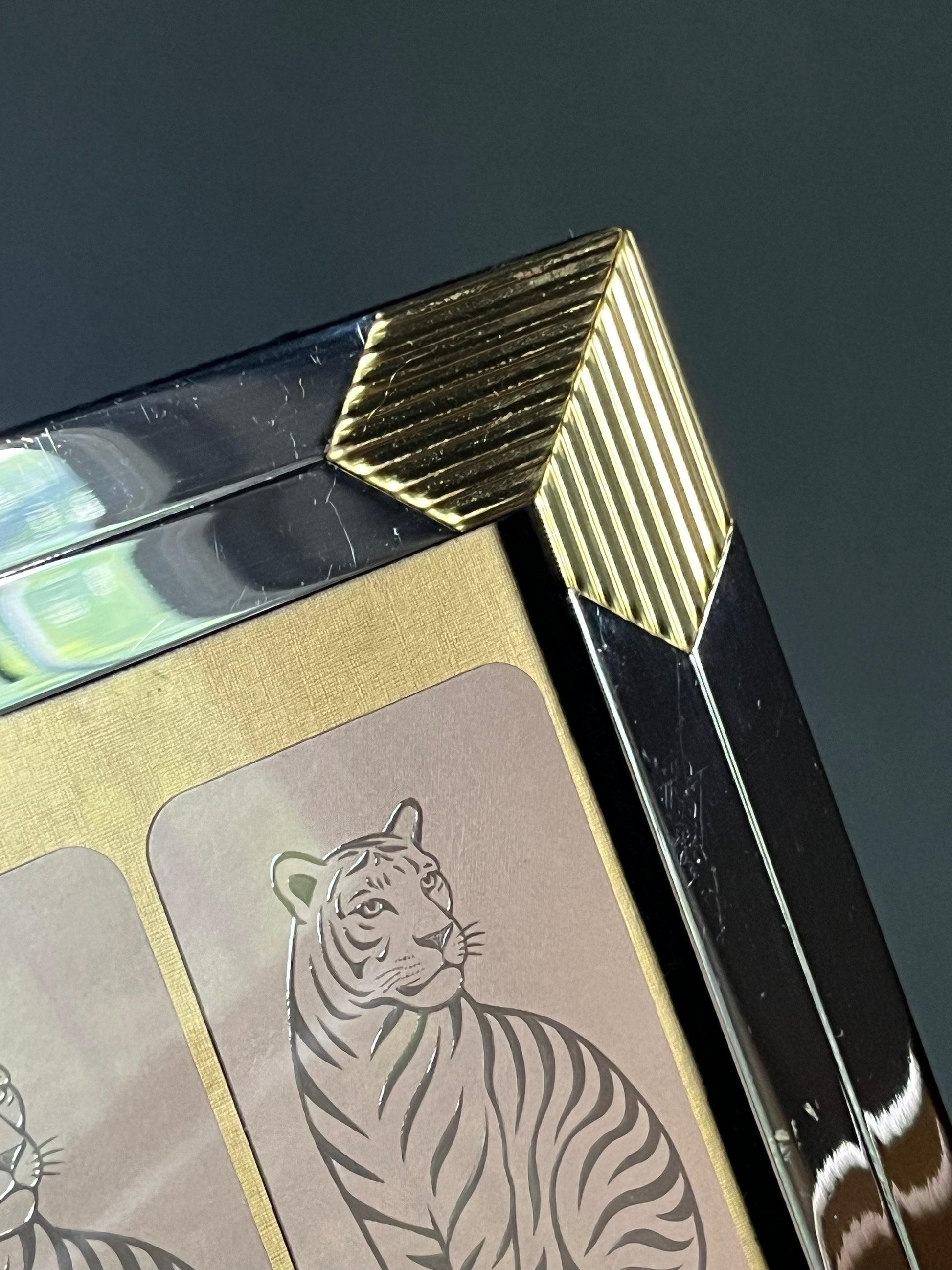 Striking Art Deco–style picture frame with silver-tone sides and gold-tone corner accents. Holds a standard 5” x 7” photo in the front, with an internal photo album accessible via side latch for storing additional prints. Sturdy construction with a stand for display.