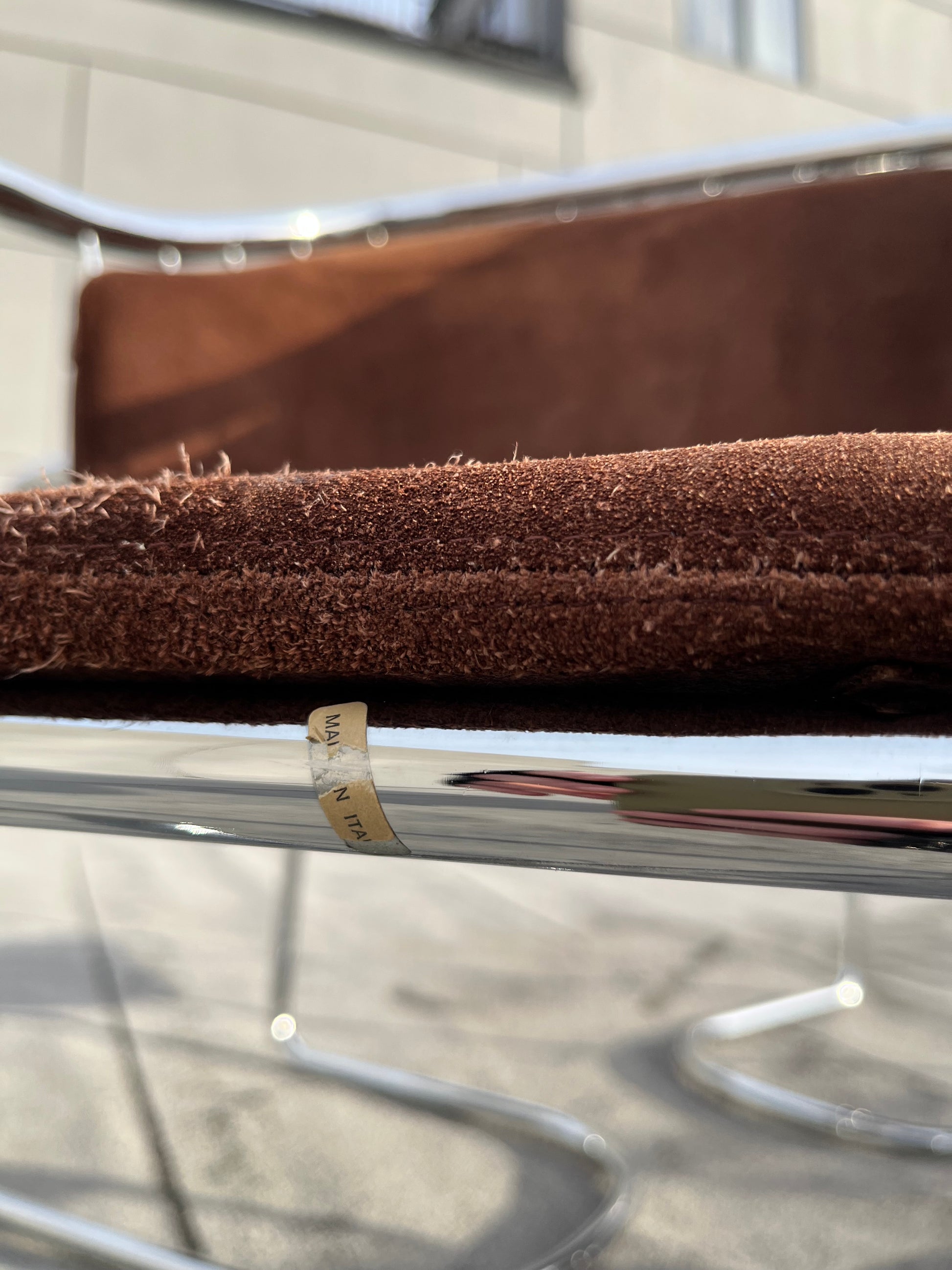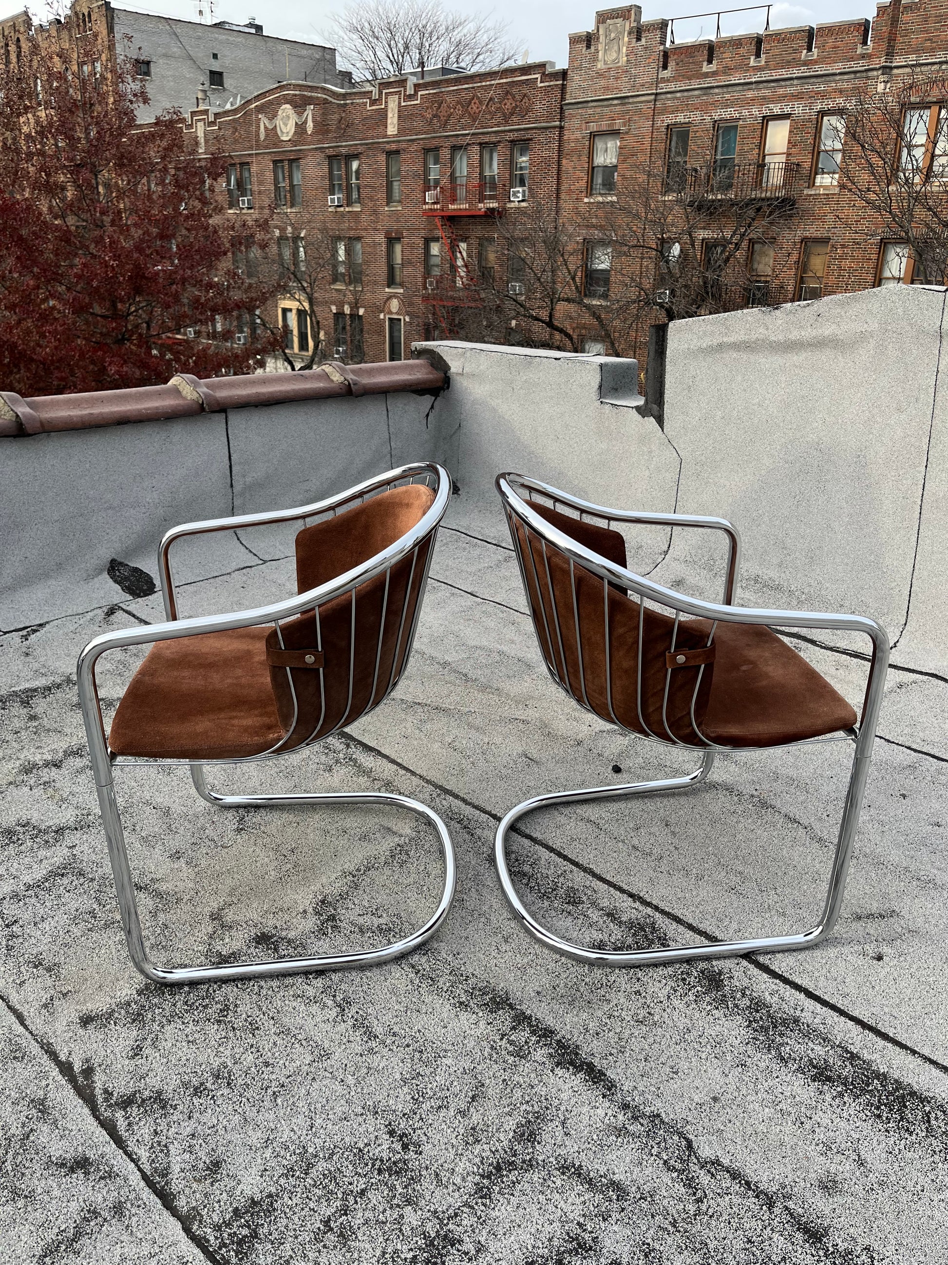 Beautiful and rare set of four vintage 1970s Italian cantilever chairs designed by Gastone Rinaldi. These sculptural chrome-framed chairs feature Rinaldi’s signature curved silhouette paired with rich chocolate brown suede seats and backs.