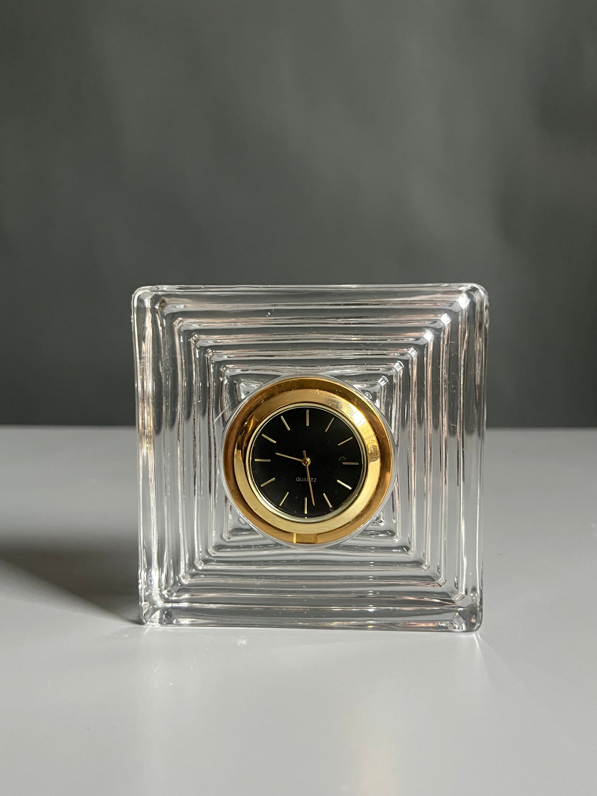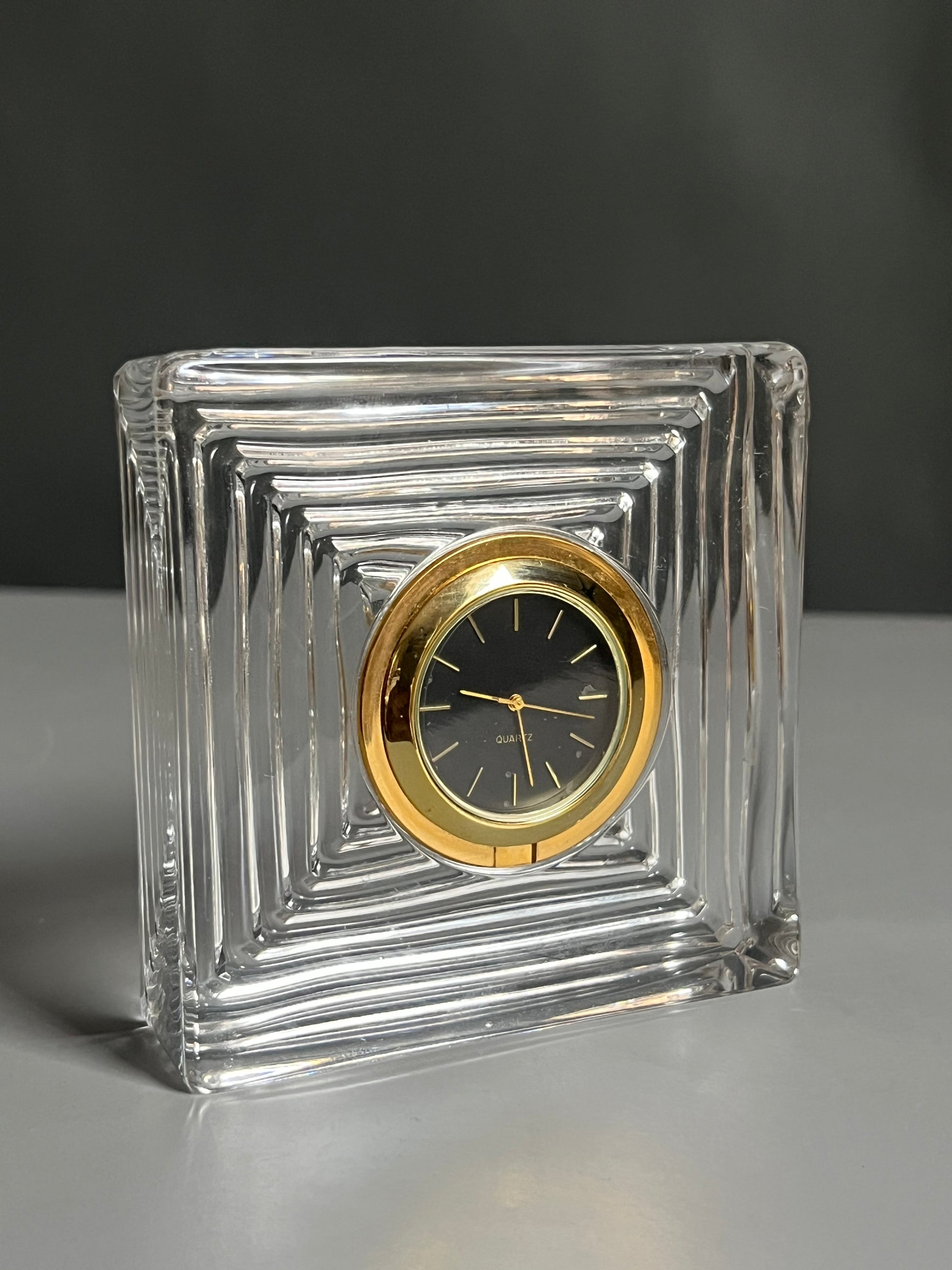 Vintage modern glass clock. Cool square design, black and gold face. In working order, takes standard watch battery.