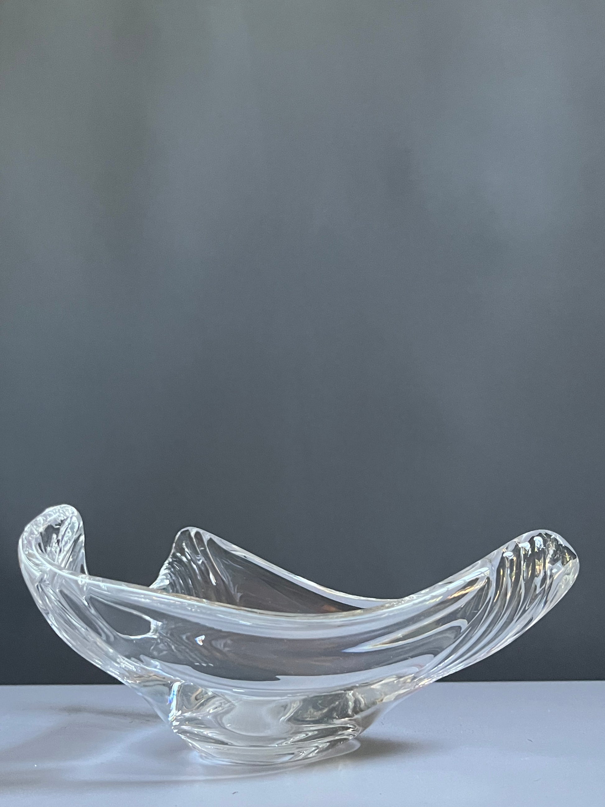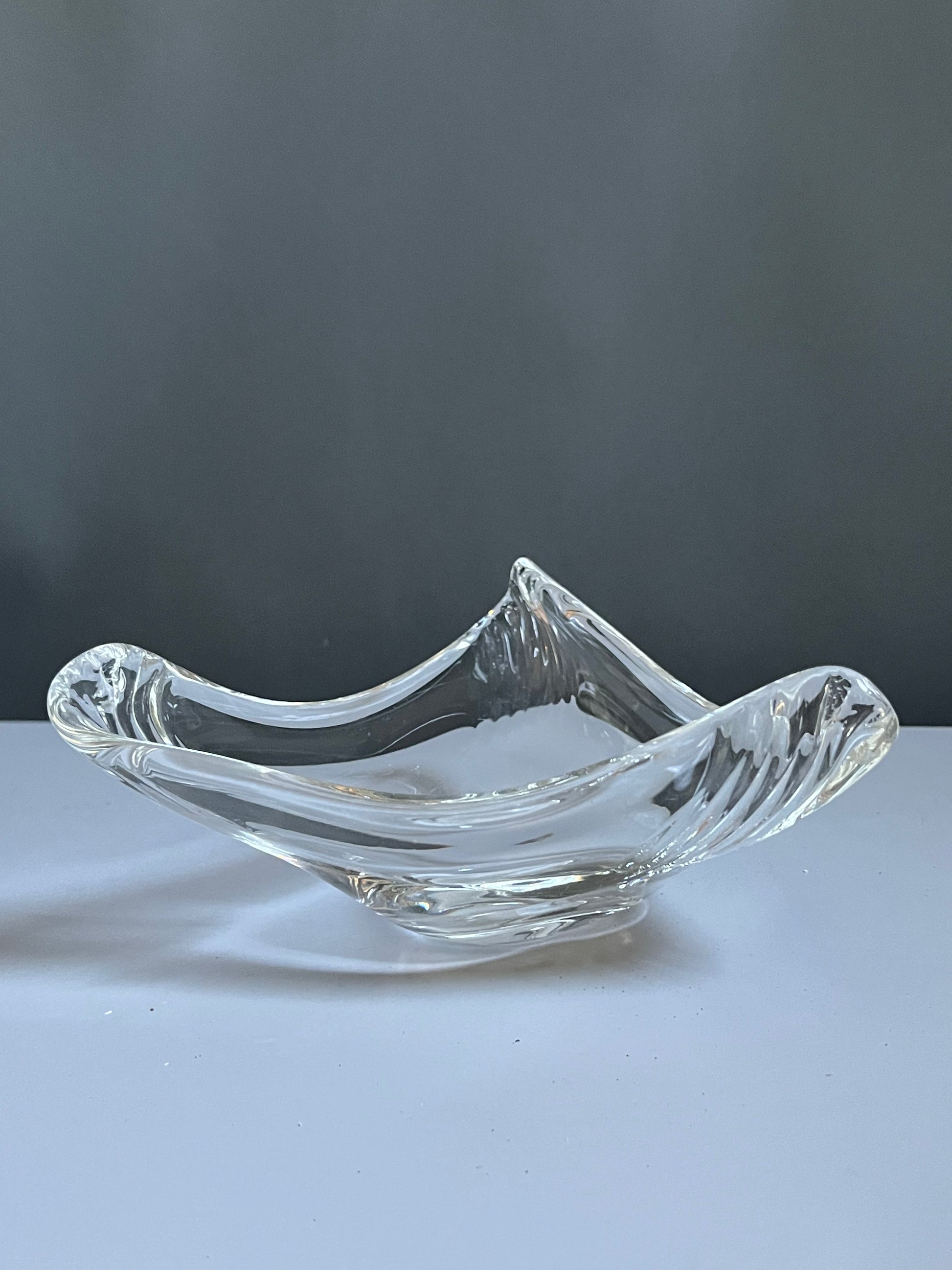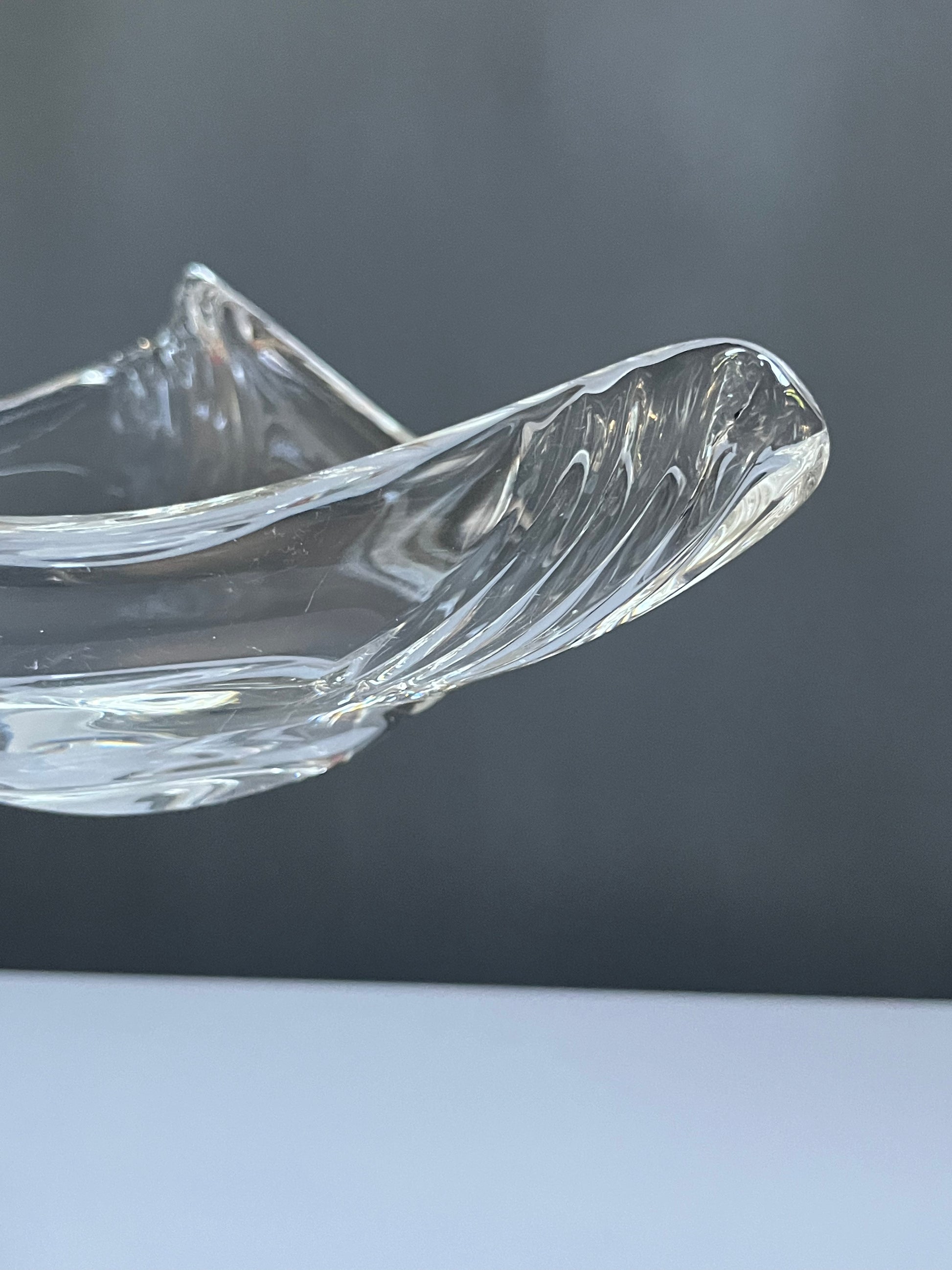 Vintage hand blown glass dish with a sculptural look. Features ridged detailing at the corners and a smooth, triangular base. Modern cool and versatile for display, catch-all or jewelry.