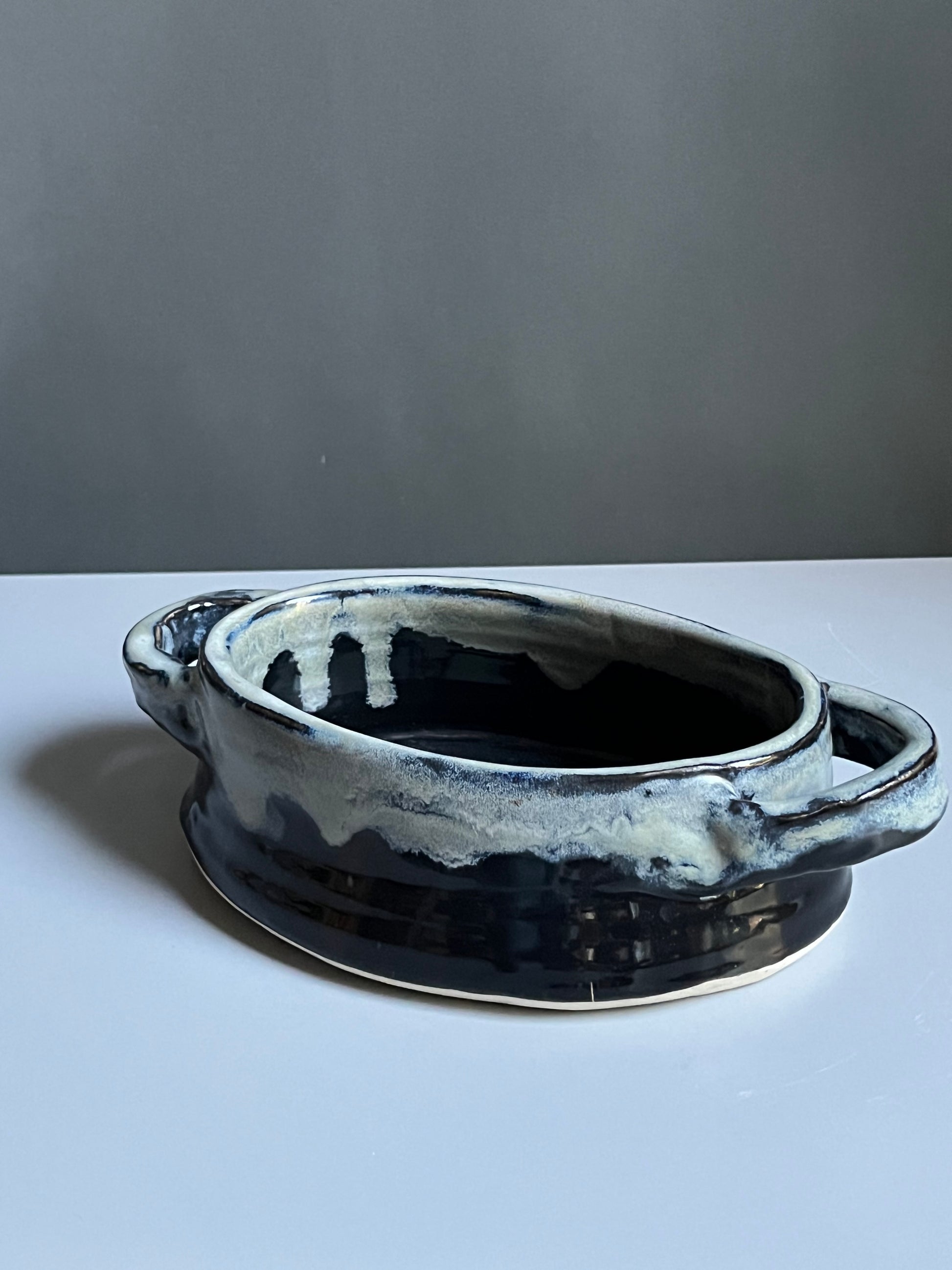 Heavyweight handmade pottery dish with an oval form and side handles. Finished in a layered glaze of deep black with gray and blue drips that create a bold, organic effect. Great as an entryway catch-all or decorative accent.