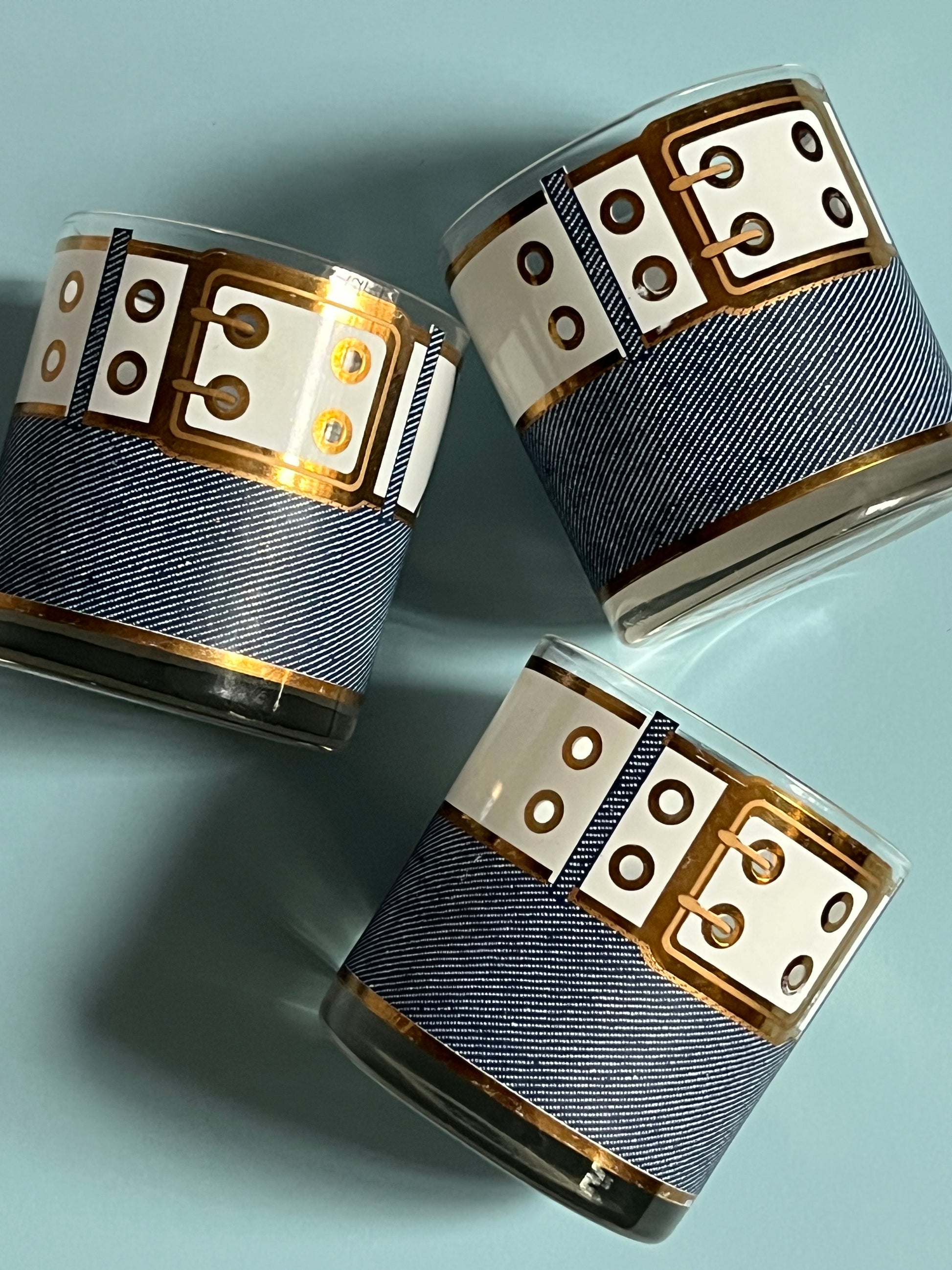 Set of 3 vintage Cera rocks glasses featuring the iconic “Denim & Belt” design. Blue faux-denim wrap with white and gold belt detail and metallic gold trim. Signed Cera near the base.