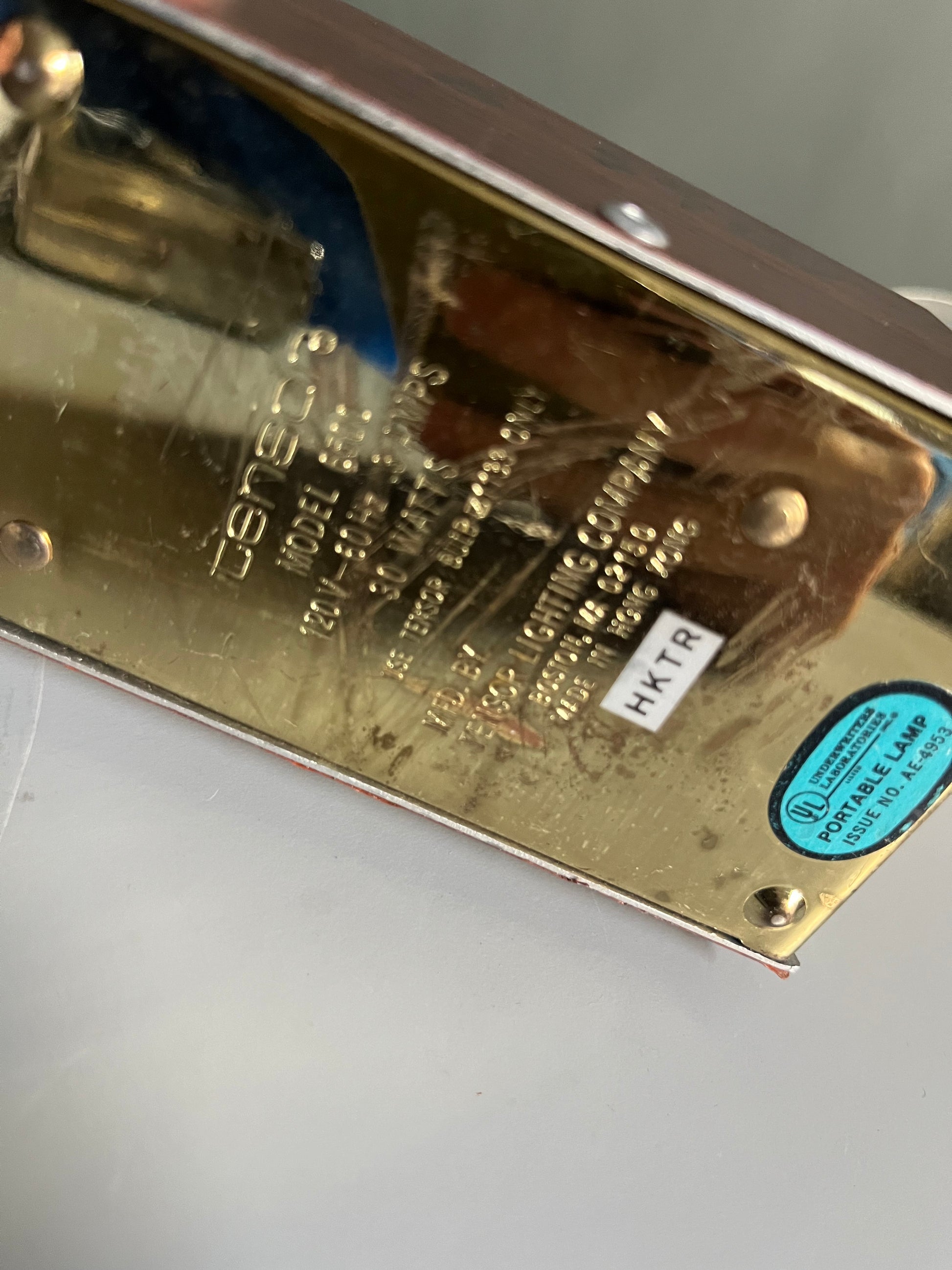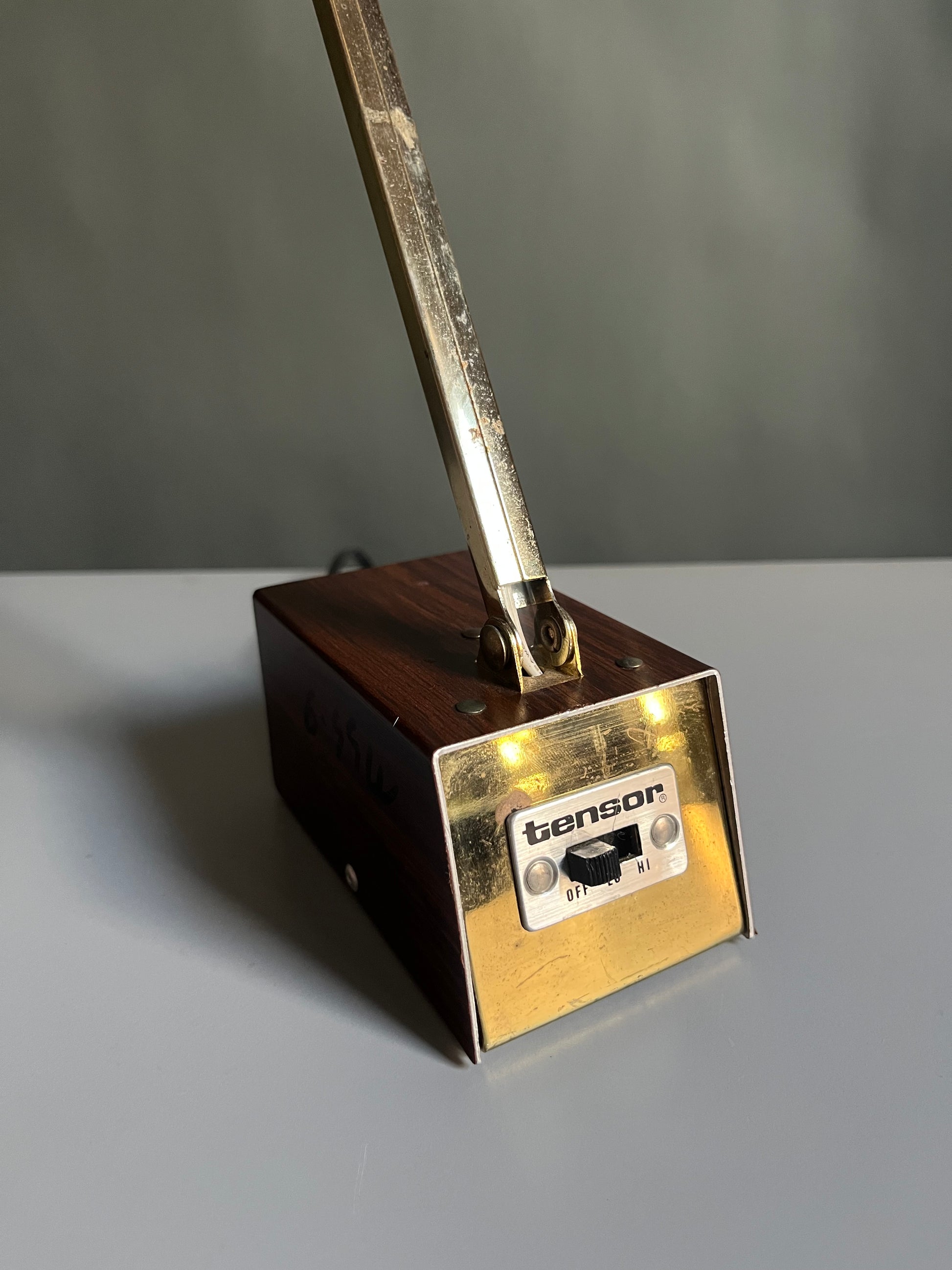 Vintage Diax Tensor Lamp – Model 6500 Mid-century modern adjustable desk lamp with woodgrain base, brass details, and brown metal shade.