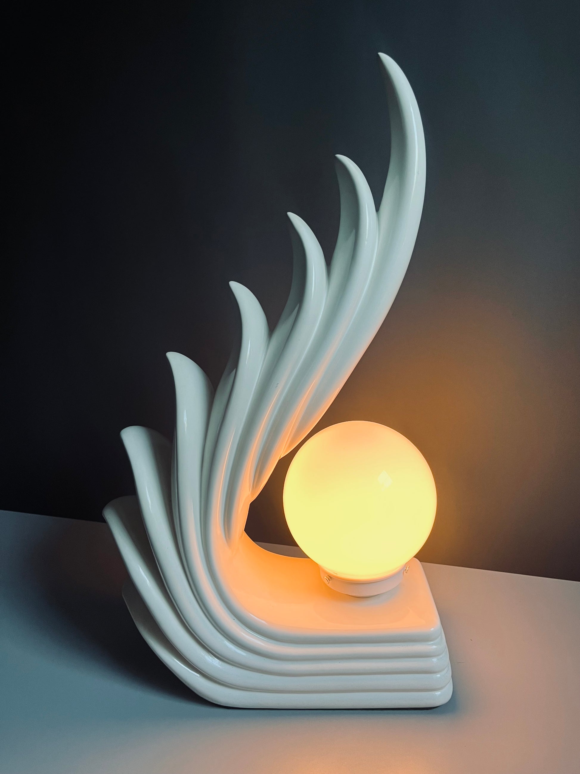 Vintage Ceramic Wave Lamp – 80s/90s Postmodern Style. Sculptural white ceramic base with flowing wave design and round globe light.