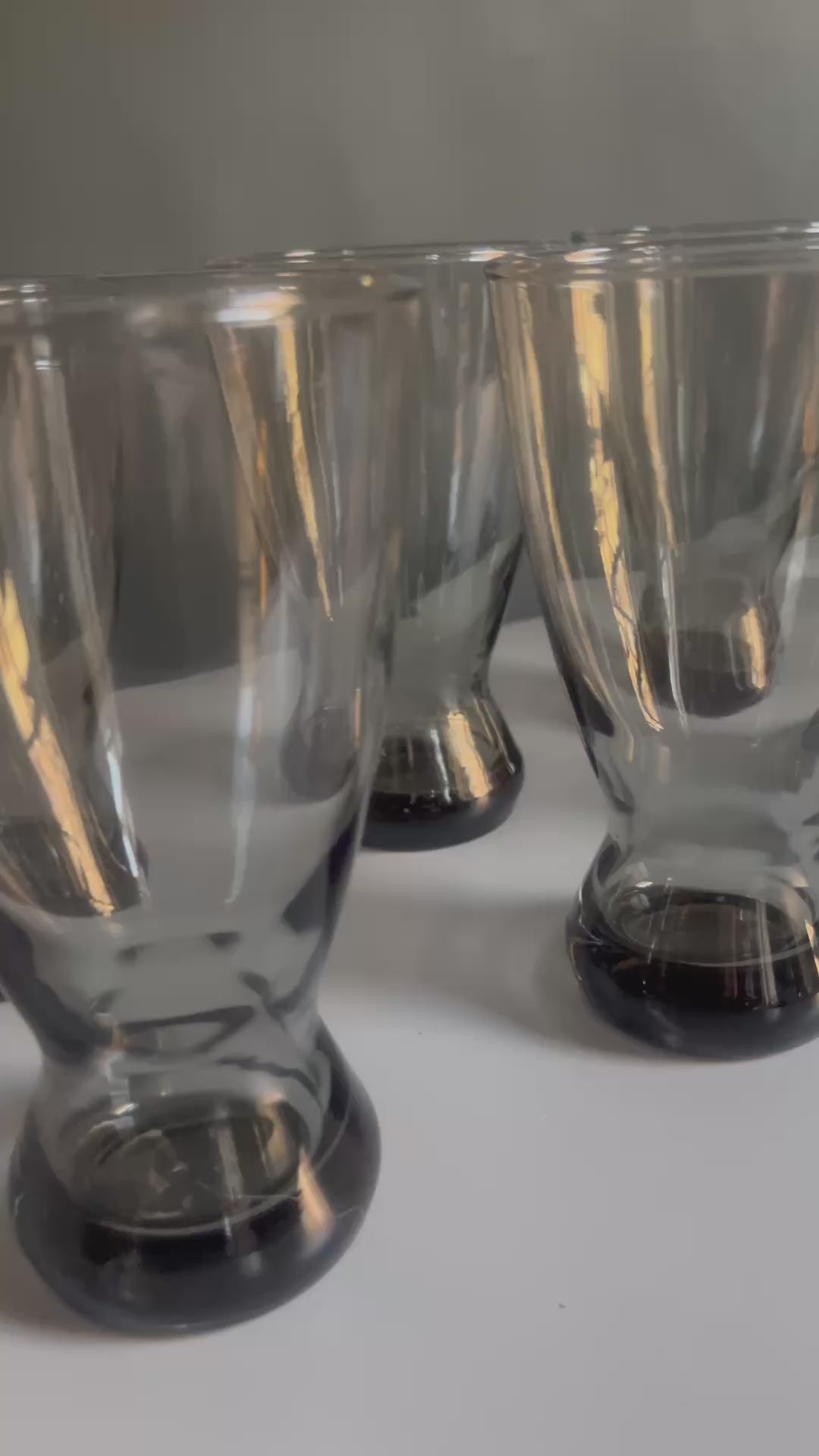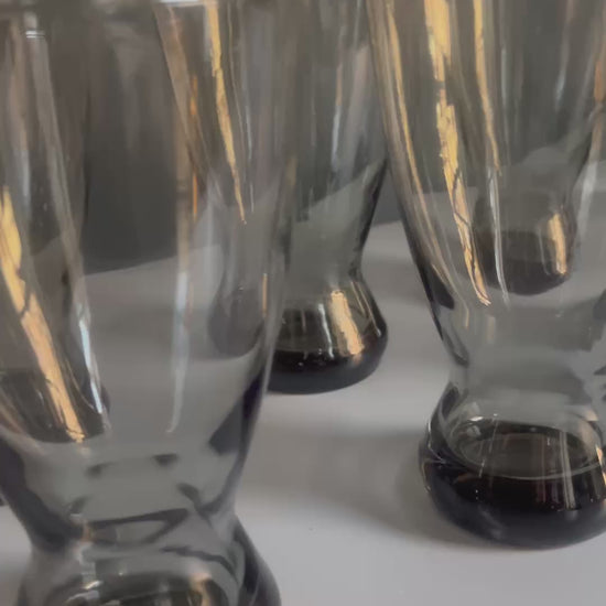 A set of six vintage mid century smoked gray drinking glasses with a tall, sculptural silhouette and flared base. Cool gray tone- modern fun. Perfect for water, cocktails, or tall pours.