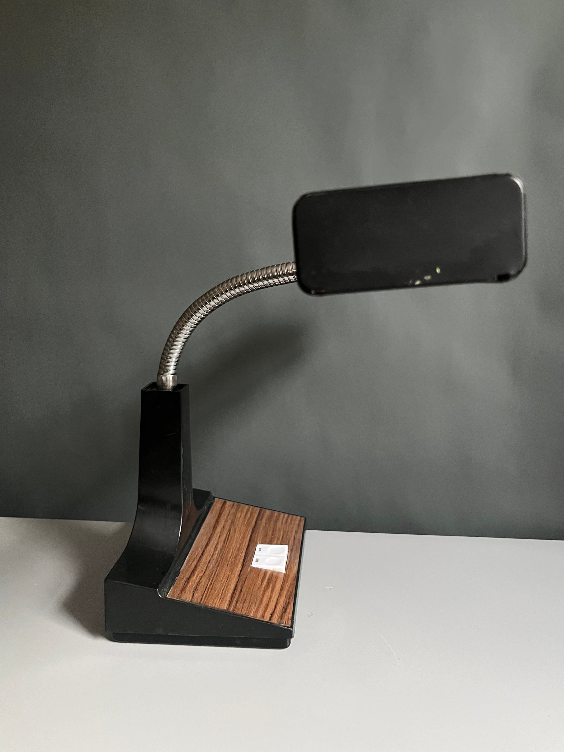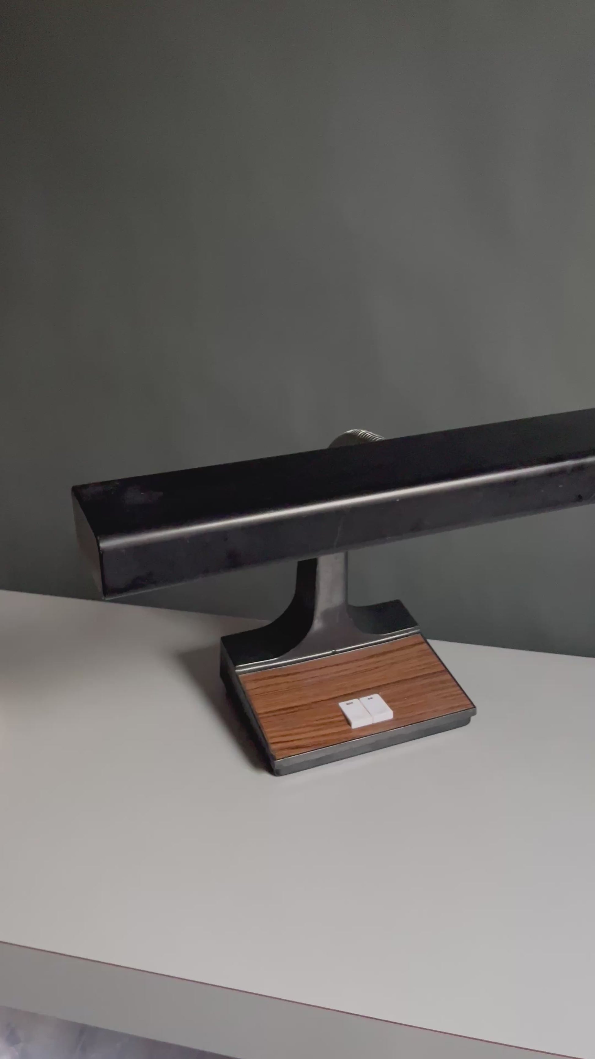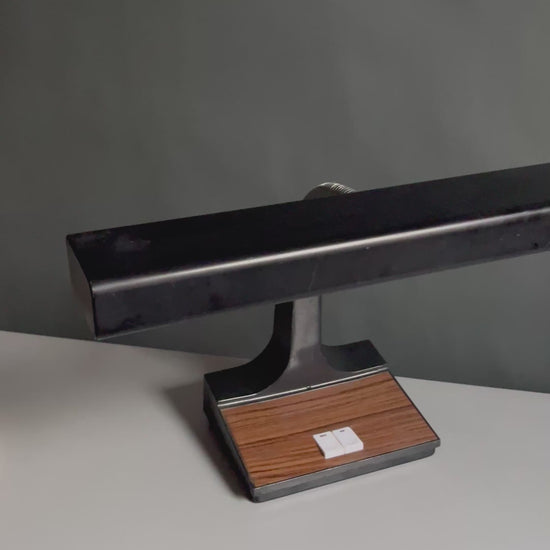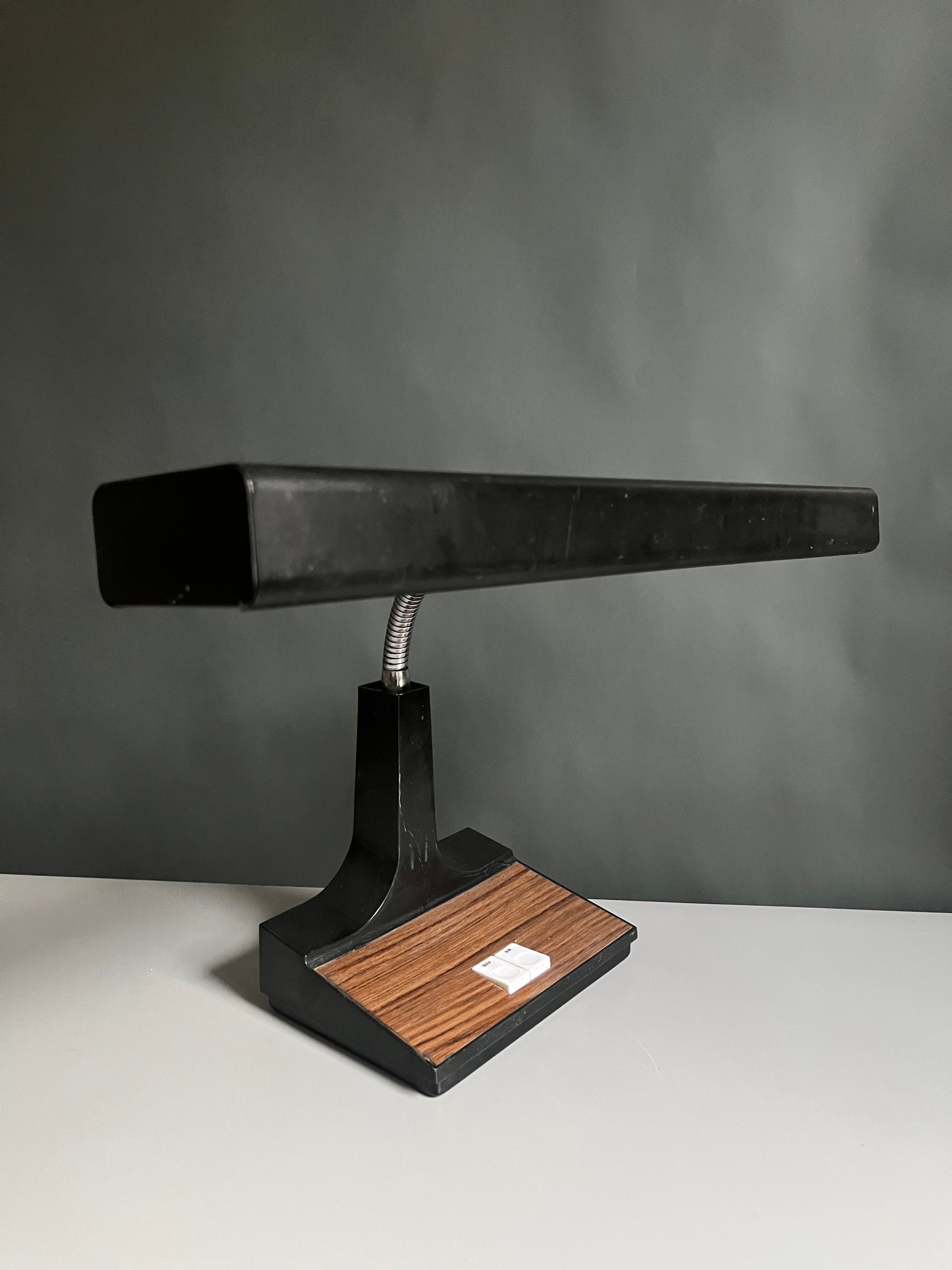 Sleek vintage desk lamp with a linear black shade, flexible chrome gooseneck, and sculptural base accented by warm woodgrain detailing.