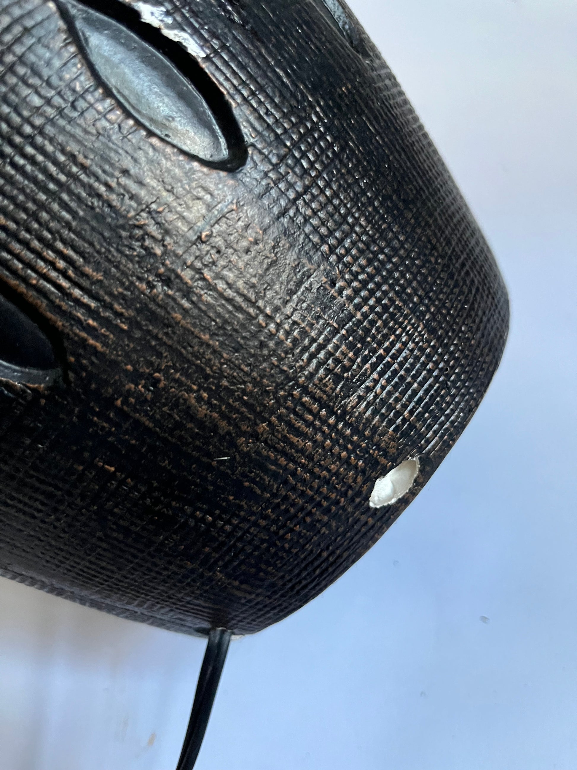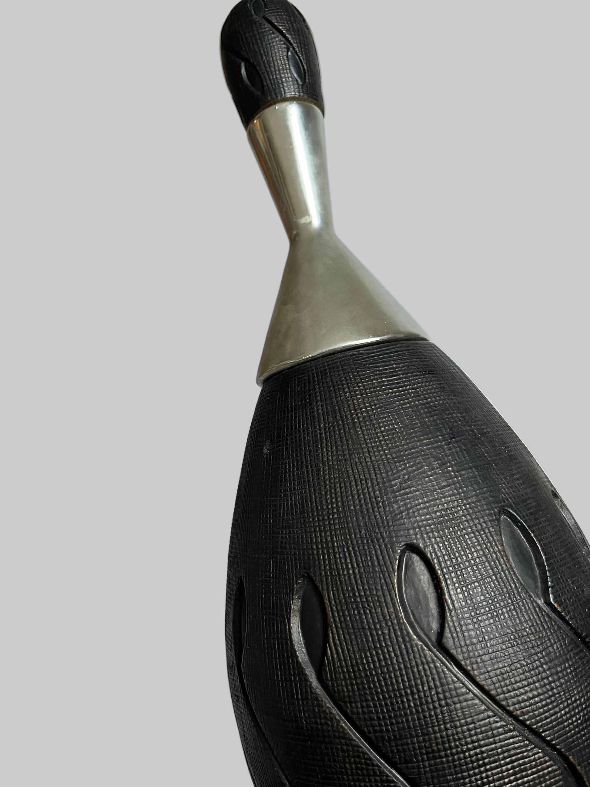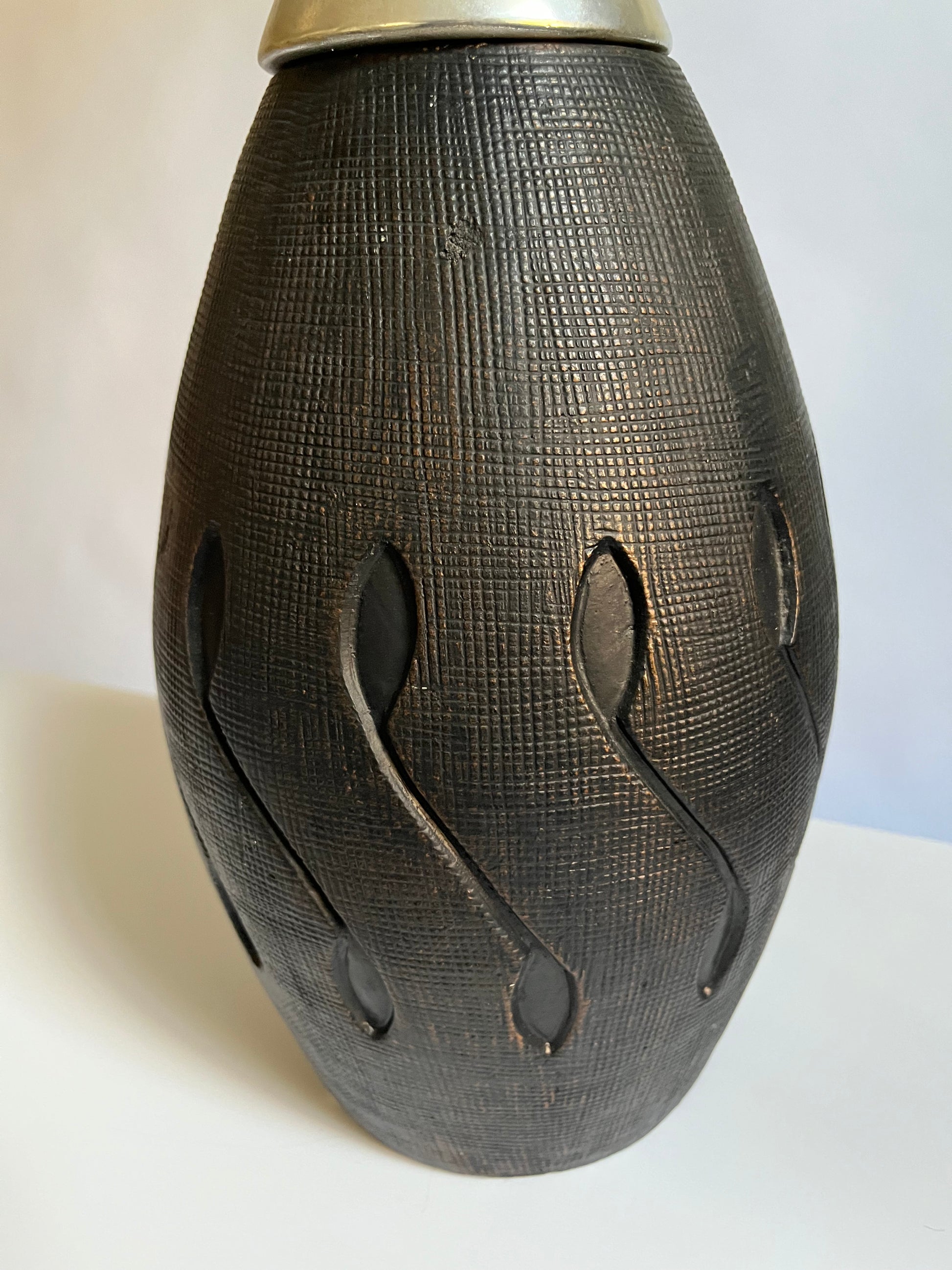 Distinctive mid-century lamp featuring a sculptural hourglass silhouette with a textured black base and carved wave-like design. The brushed aluminum accent adds a minimalist pop.