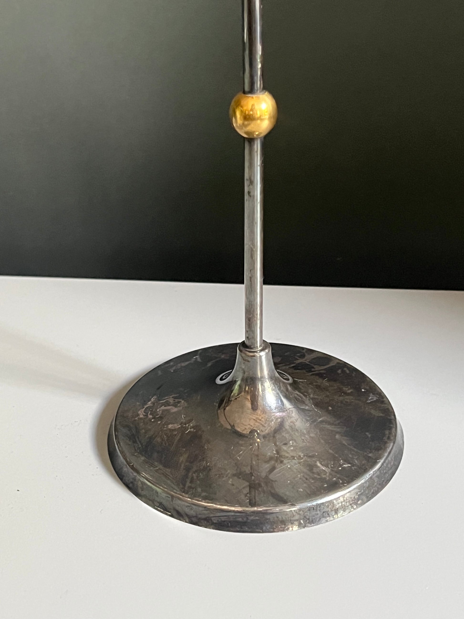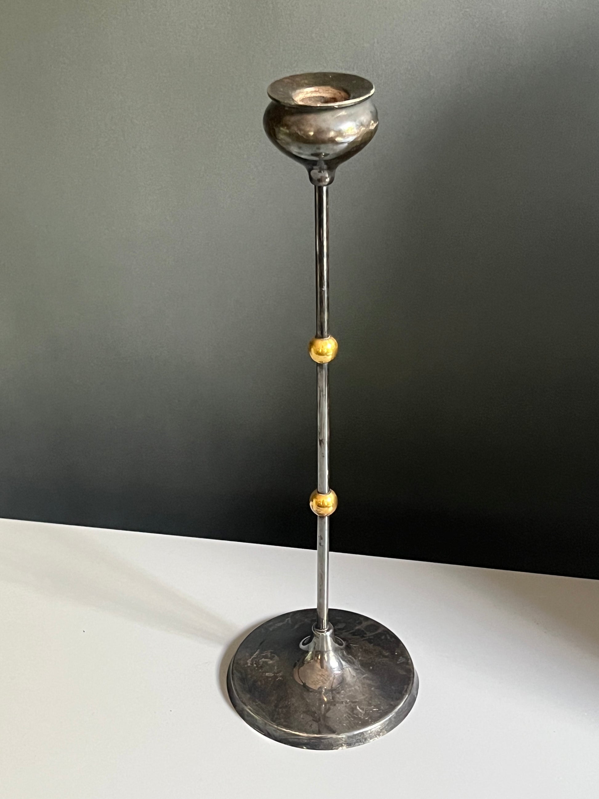 Striking vintage tall taper candle holder with a sculptural modernist design. Features a polished silver-tone body accented by two golden orb details along the stem and a wide round base for stability. The flared cup securely holds a standard taper candle.