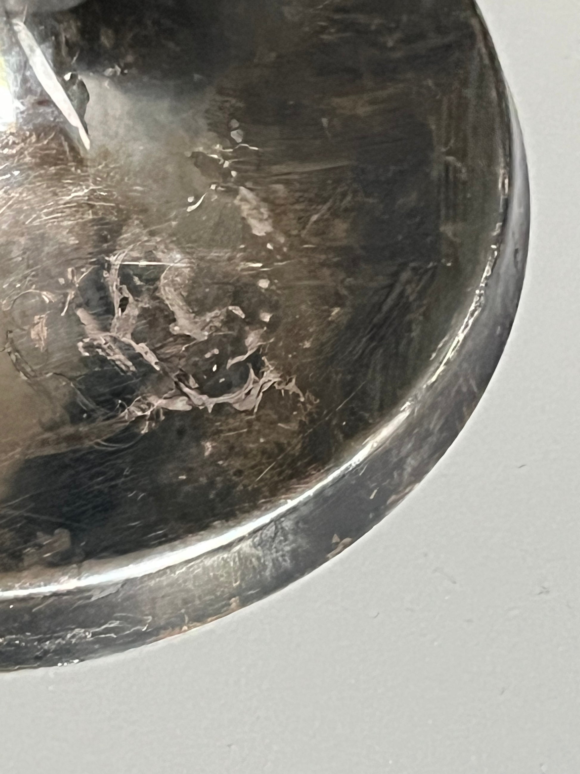 Measures approximately 12.5”H x 4”W (at base) a fair amount of patina and wear consistent with age. Engraved with initials on the base, hard to see under patina but there’s a story there of past owners 🙂