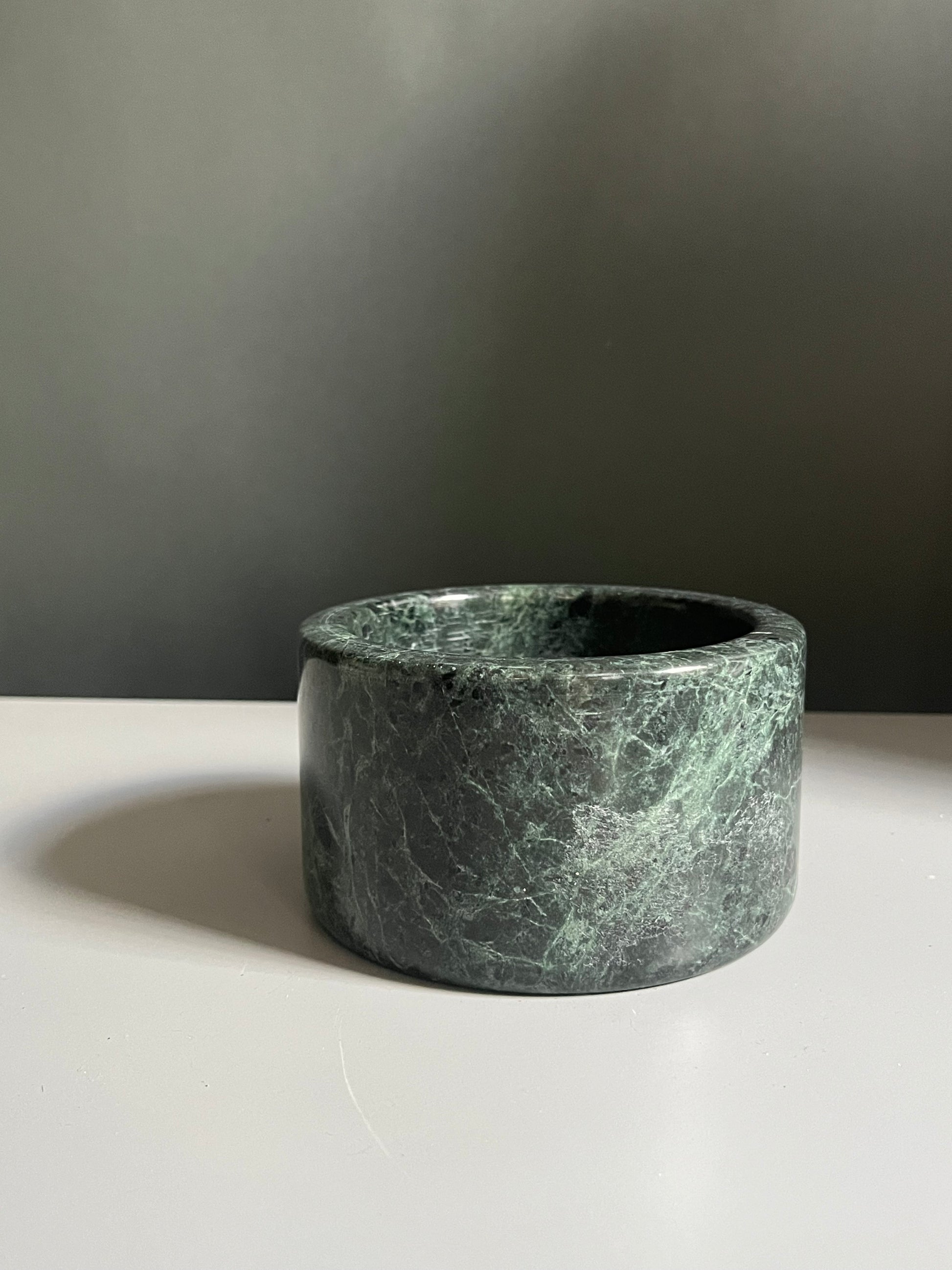 Cylindrical green marble vessel with a smooth polished finish and subtle veining. Features a weighted base with felt backing for surface protection. Minimalist design makes it versatile for use as a bowl, catchall, or decorative accent.