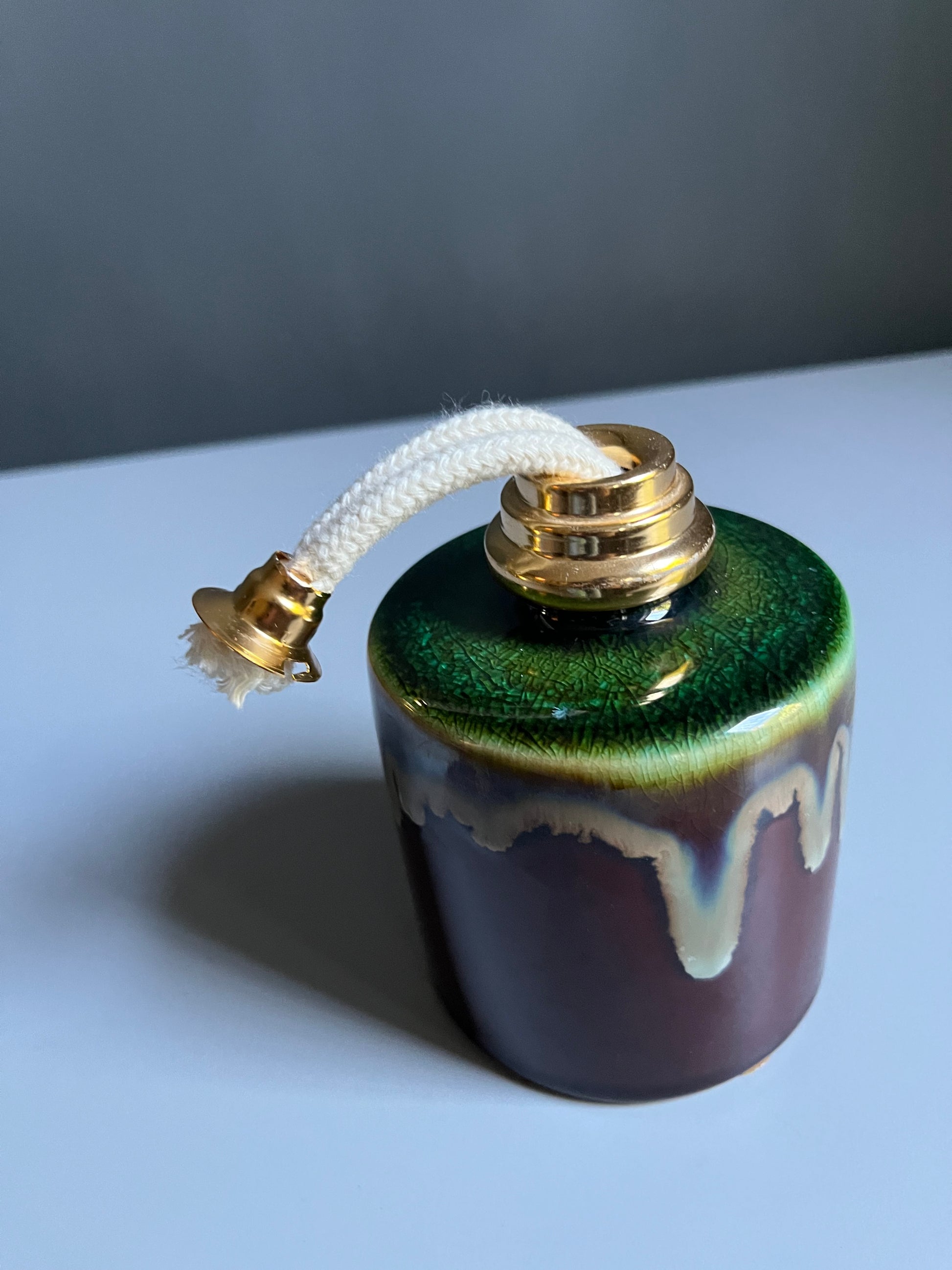 Glazed ceramic oil lantern with vivid green, brown, and cream drip glaze. Crackle finish on top, fitted with a gold-tone burner and cotton wick. Fillable base, functional and decorative.